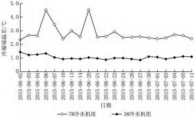 廣場空調機房擁有12臺某品牌集中空調冷水機組,其中3#離心式冷水機組制冷量為2110kW,輸入功率為400kW,安裝了冷水機組同品牌端蓋式膠球清洗裝置,其控制系統與冷水機組互聯互通,根據冷凝端溫差控制膠球清洗使得二者在其佳效率點附近運行。7#離心式冷水機組制冷量為4218kW,輸入功率為738kW,2臺冷水機組共用冷卻水源,冷凝器換熱管均進行了捅炮清洗。圖7顯示了3#和7#冷水機組冷凝端溫差。從圖7可以看出:未安裝膠球清洗裝置的7#機組2015年6—7月的冷凝端平均溫差為2.80℃,而安裝了冷水機組同品牌膠球清洗裝置的3#機組冷凝端平均溫差為1.05℃,3#機組比7#機組單位制冷量的能耗降低了6.8%,表明同品牌膠球清洗裝置是保證冷水機組始終處于高效運行的關鍵設備。