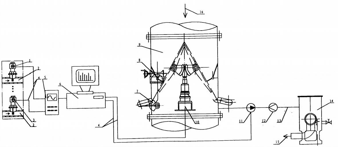 圖中:1、壓力壓差變送器2、凝汽器冷凝水分管道3、溫度測量變送器4、信號電纜5、污垢熱阻監(jiān)測儀6、多媒體計算機7、出球水量調(diào)節(jié)器8、阻渦流調(diào)節(jié)器9、收球網(wǎng)10、電動執(zhí)行機構(gòu)11、膠球泵12、防止膠球倒流止回裝置13、管道14、裝球室15、箭頭16、箭頭