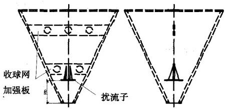 (3)經(jīng)過(guò)與廠家協(xié)商,為克服循環(huán)水出口壓力偏高造成的膠球在收球網(wǎng)內(nèi)的強(qiáng)烈旋轉(zhuǎn),如圖2所示,在膠球清洗裝置內(nèi)部加裝擾流子,要求擾流子材質(zhì)為Q235,擾流子和收球網(wǎng)加強(qiáng)板要可靠地焊接。以降低冷凝器循環(huán)水出口的壓力及膠球在收球網(wǎng)內(nèi)部的旋轉(zhuǎn)強(qiáng)度,從而使膠球順利地落入收球網(wǎng)底部,及時(shí)送入收球泵入口管道。