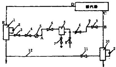 注:1——收球網(△Ps),2——差壓測量裝置,3——閘閥,4—球閥,5——膠球泵,6——裝球室,7-—放水門,8——故氣門,9——膠球管路(△P?),10——二次濾網,11--排污蝶閥,12——--排污管路