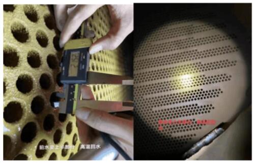 通過檢修期間對電廠機組凝汽器內部鈦管的檢查發現,凝汽器內部鈦管結垢嚴重,特別是高溫回水區域特別明顯。實際直徑參數
