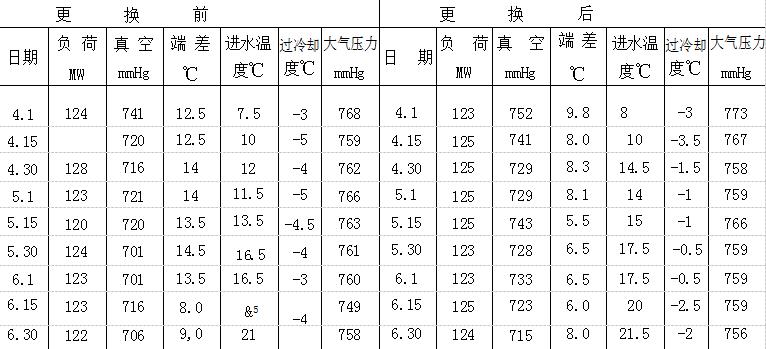 2、每臺機(jī)每兩天進(jìn)行一次膠球清洗,每次投入300個(gè)膠球,清洗1小時(shí),收球半小時(shí)。經(jīng)過兩年的實(shí)踐,證明14FH-5-0凈水器和S-14-0收球網(wǎng)操作方便、除污性強(qiáng)、耐海水腐蝕、收球率在95%以上、對凝汽器冷卻管保護(hù)膜沒有損壞、減輕了檢修人員的勞動(dòng)。凝汽器各項(xiàng)經(jīng)濟(jì)指標(biāo)大有好轉(zhuǎn),經(jīng)濟(jì)效益顯著提高。以1號機(jī)為例,更換前、后每月抽出三天,以每天上午9點(diǎn)鐘的運(yùn)行參數(shù)進(jìn)行同期比較,見附表.