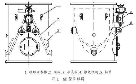 近幾年來(lái),黃埔電廠、漳澤電廠、蘭州第二熱電廠等多家電廠均進(jìn)行了設(shè)備改造,改造后的設(shè)備運(yùn)行良好,收球率可達(dá)95%以上。改造后的收球網(wǎng)采用SF型,如圖1所示。1收球網(wǎng)本體;2網(wǎng)板;3導(dǎo)流板;4推進(jìn)機(jī)構(gòu);5軸系圖1SF型收球網(wǎng)改造后的設(shè)備結(jié)構(gòu)大大簡(jiǎn)化,采用兩個(gè)網(wǎng)板,膠球經(jīng)網(wǎng)板一次匯集即可由引出管引出。網(wǎng)板上存在雜物需要清洗時(shí),將網(wǎng)板置反洗位。