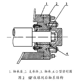 (4)傳動(dòng)機(jī)構(gòu)老產(chǎn)品的各個(gè)網(wǎng)板分別由各自的執(zhí)行機(jī)構(gòu)控制,在實(shí)際運(yùn)行中容易出現(xiàn)不同步。老產(chǎn)品所用的電動(dòng)執(zhí)行機(jī)構(gòu)自鎖性能也較差,不能控制網(wǎng)板平穩(wěn)準(zhǔn)確轉(zhuǎn)動(dòng),在實(shí)際運(yùn)行中時(shí)常發(fā)生兩個(gè)網(wǎng)板沒(méi)有同時(shí)與外殼內(nèi)壁貼緊,出現(xiàn)漏球。改造后,收球網(wǎng)兩個(gè)網(wǎng)板由同一個(gè)執(zhí)行機(jī)構(gòu)控制,又采用了大減速比的螺旋執(zhí)行機(jī)構(gòu)推進(jìn),動(dòng)作平緩,自鎖性好,解決了網(wǎng)板不同步問(wèn)題。在設(shè)備運(yùn)行時(shí),網(wǎng)板受到水流沖擊也不會(huì)發(fā)生抖動(dòng)。1軸承座;2支承體;3軸承;4O型密封圈圖2SF收球網(wǎng)后軸系結(jié)構(gòu):