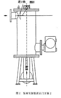 A)考慮以下3種方案:在原系統管路中裝球室入口處增加能夠實現逆止功能的止回閥。根據系統壓力及膠球循環管路通徑,可選用H44)-6型旋啟式止回閥。其優點是:不需要對現有裝球室做任何改動,巳逆止效果好,但缺點是增加了系統中的閥門,成本增加較多,而且因閥門安裝在系統管路上,不能將膠球完全阻隔于裝球室內。