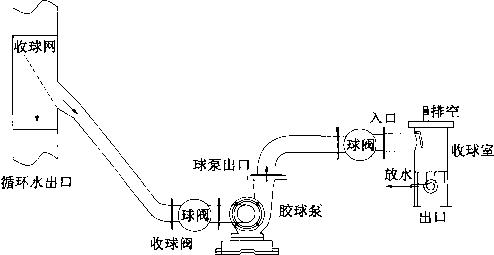2)各管路和彎頭的安裝按圖1進行。收球網(wǎng)的出膠球口必須高于膠球泵入口0.5m及以上;各接口有彎頭過渡連接的,彎頭要大于或等于90。彎徑好大于2.5倍管徑。